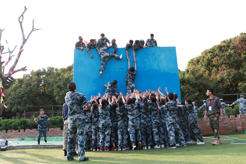 畢業(yè)墻訓(xùn)練項(xiàng)目中4.2米的高墻,沒有任何工具; 要求所有隊(duì)員全部通過,能夠依靠的只有雙手和雙肩; 一個(gè)人的力量是有限的,但團(tuán)隊(duì)的力量是無窮的!
