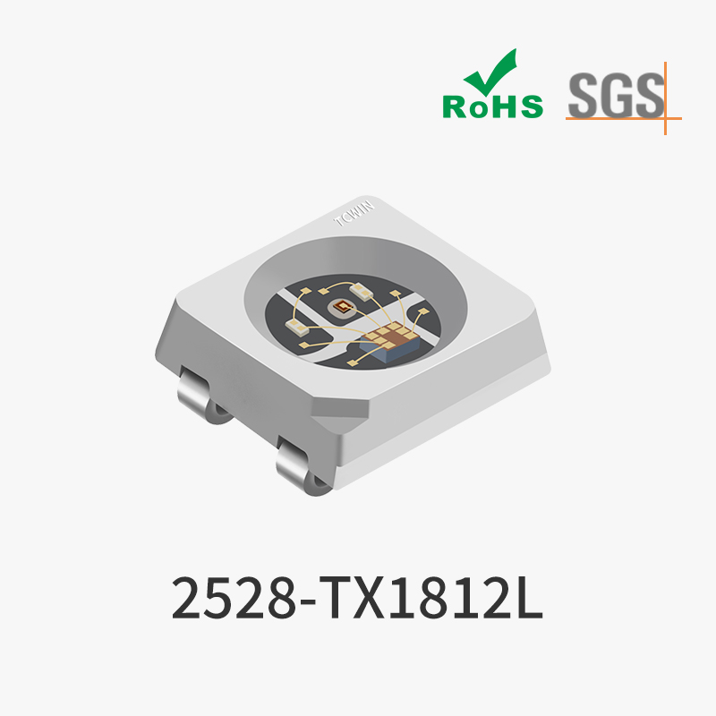 深圳天成照明所封裝生產的2528幻彩燈珠,型號為:TX1812L和TX1812L5,驅動電壓為5V,電流參數為12ma和5ma兩個配置,發光角度120度,灰度等級256,發光顏色原理可達千萬級色彩。2528適應型體積內封RGB三原色發光芯片,再在RGB基礎上嵌入信號IC作為實現單點單控,逐點掃描功能的升級。實現單顆燈珠可通過外部muc進行編程控制,單顆燈珠可尋址,主要體現效果為單路電路設計可實現產品RGB光效的更多樣化。燈光跑馬。漸變,流水流光效果更佳。 小體積的smd封裝更貼合特殊空間的設計排布。很多時候在設計產品光效的時候,因為考慮到應用空間的大小,電路走線等原因,要么燈珠數量不夠造成光斑,暗區等外觀缺點,要么燈珠體積太大,有限空間無法進行貼片生產。而2528幻彩燈珠針對此類設計難點進行封裝,功能升級,實現可以在單面板單線路多功能的光效設計。主要應用領域為:LED幻彩燈條、便攜式夢幻音響、電腦機箱、風扇裝飾燈、LED柔性全彩點陣像素屏、LED幻彩服飾、LED幻彩鍵盤、航模、智能手環等產品。